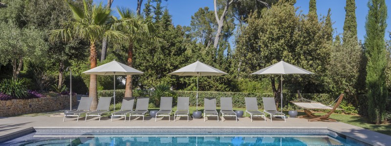 Der Pool kann beheizt werden, ist 11 x 4 Meter groß und befindet sich vor dem Haus mit Sonnenliegen für zwölf Personen und einem Tagesbett, auf dem Sie sich entspannen und die schönen Berge genießen können. Ein weiterer Entspannungssofabereich im Garten bietet weiteren Raum, um die Seele baumeln zu lassen, während die Hängematte im Schatten der Palmen der ultimative Ort für einen Mittagsschlaf ist.